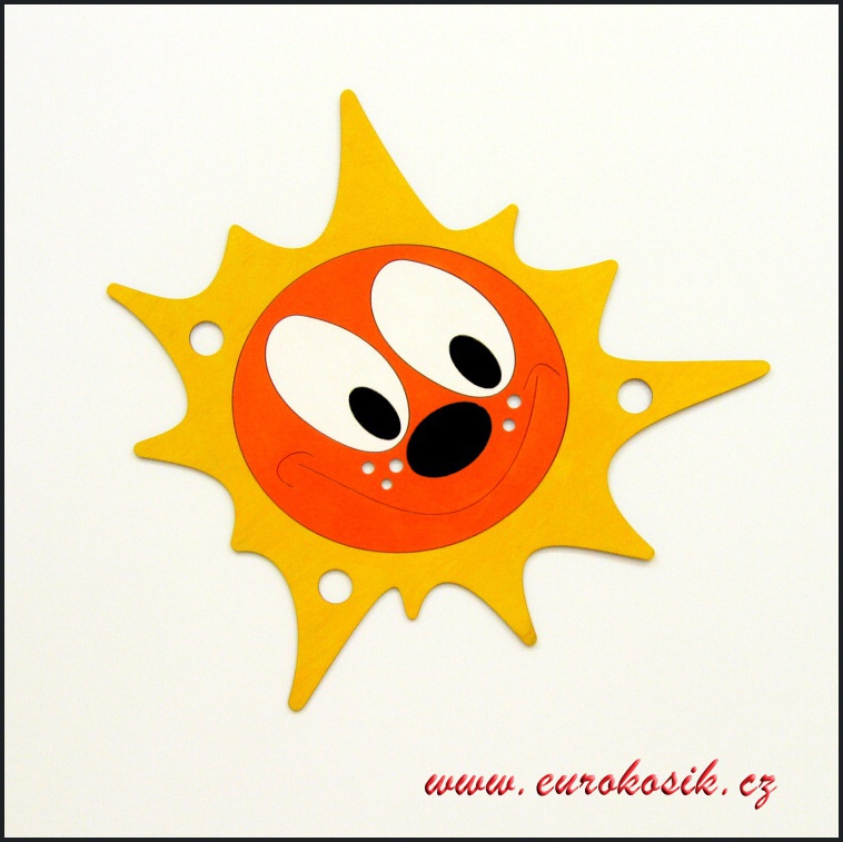 Dětská dřevěná dekorace na zeď, ručně malovaná, určená k instalaci nejen na stěnu 800x800mm. Připevnit lze oboustrannou lepící páskou (součástí balení), silikonem nebo kovovou jehlou. Možno kombinovat s ostatními výrobky a vytvářet vlastní sestavy dekorací. Součástí balení jsou i žlutá kolečka, která lze nalepit okolo sluníčka.