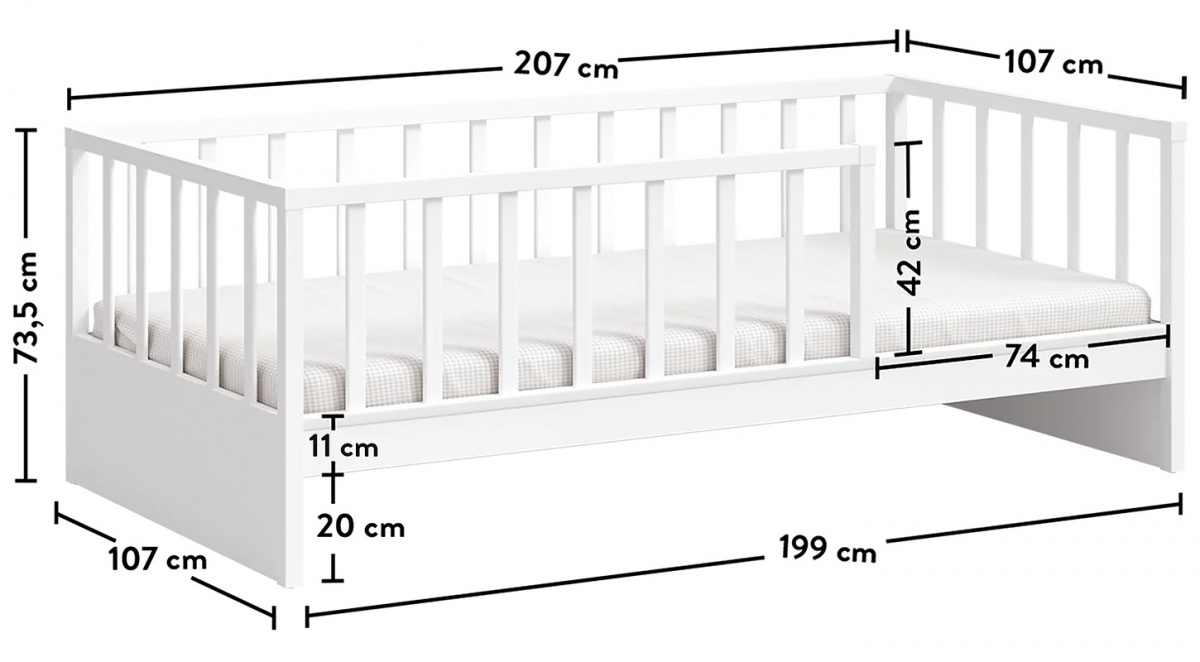 Rozměry dětské postele 100x200cm se zábranami Fairy jsou 207x74x107cm (š, v, h).