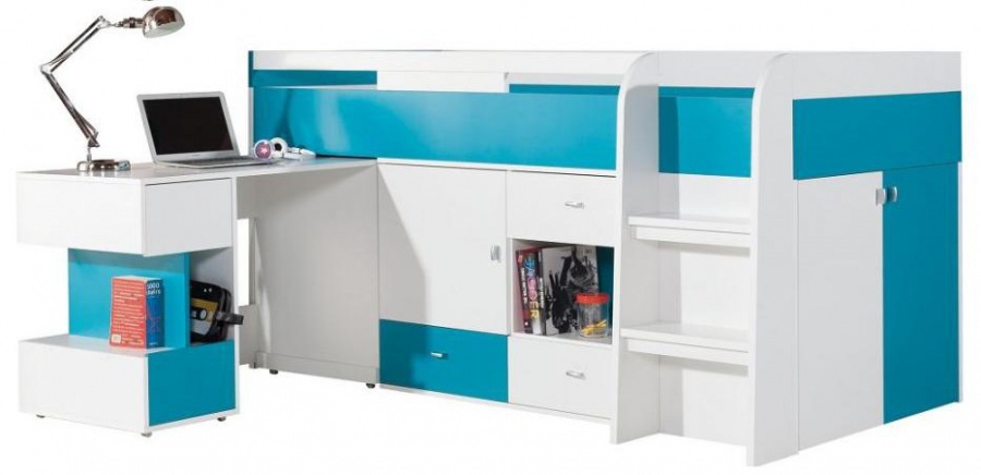 Další moderní variantou dětského nebo studentského pokoje je sestava Moli. Jde o variabilní nábytek, kde si můžete vybrat jednotlivé díly a tím poskládat dětský nebo studentský pokoj podle vašich představ. Nábytek je vyroben z kvalitního lamina, hrany jsou opatřeny ABS lištou a je zde možnost výběru ze dvou odstínů: bílý lux/tyrkys nebo bílý lux/žlutá. Díky barevnému provedení lze nábytkem vybavit jak dívčí, tak chlapecké pokoje. Postel se vyrábí ve dvou barevných provedeních. Postel není možné poskládat v jiné variantě, než je na obrázku, tzn. žebřík je vždy vpravo a stolek vlevo.
