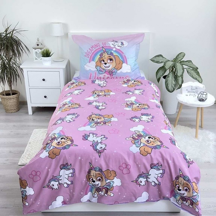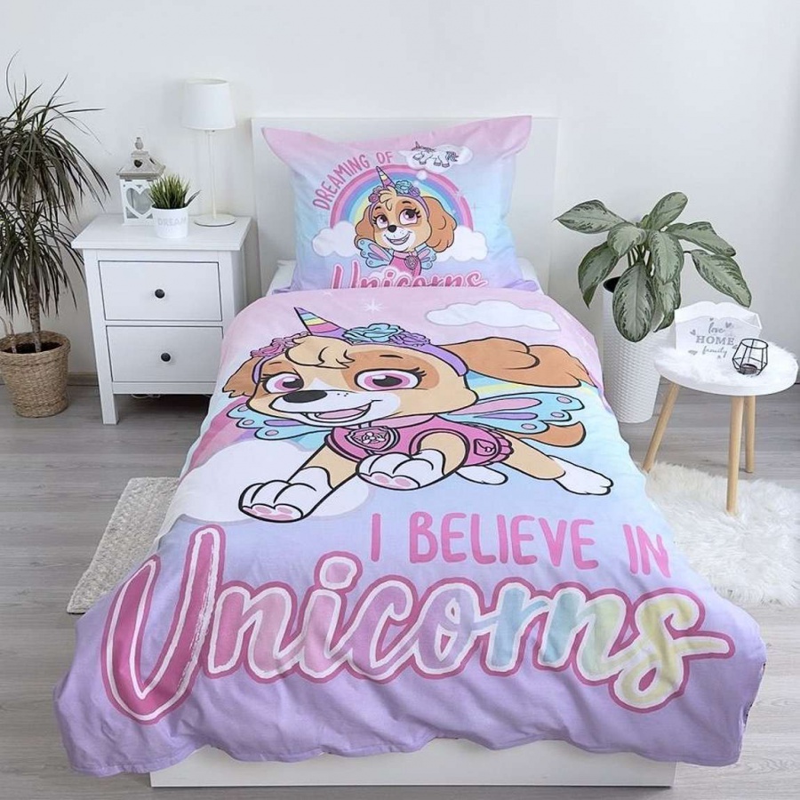Krásné a barevné dětské povlečení s motivem oblíbené hrdinky Skye z Tlapkové patroly (Paw Patrol) v roztomilém jednorožčím stylu potěší každého malého fanouška této animované série. Povlečení je vyrobeno ze 100% bavlny, která je příjemná na dotek, prodyšná a šetrná k dětské pokožce.