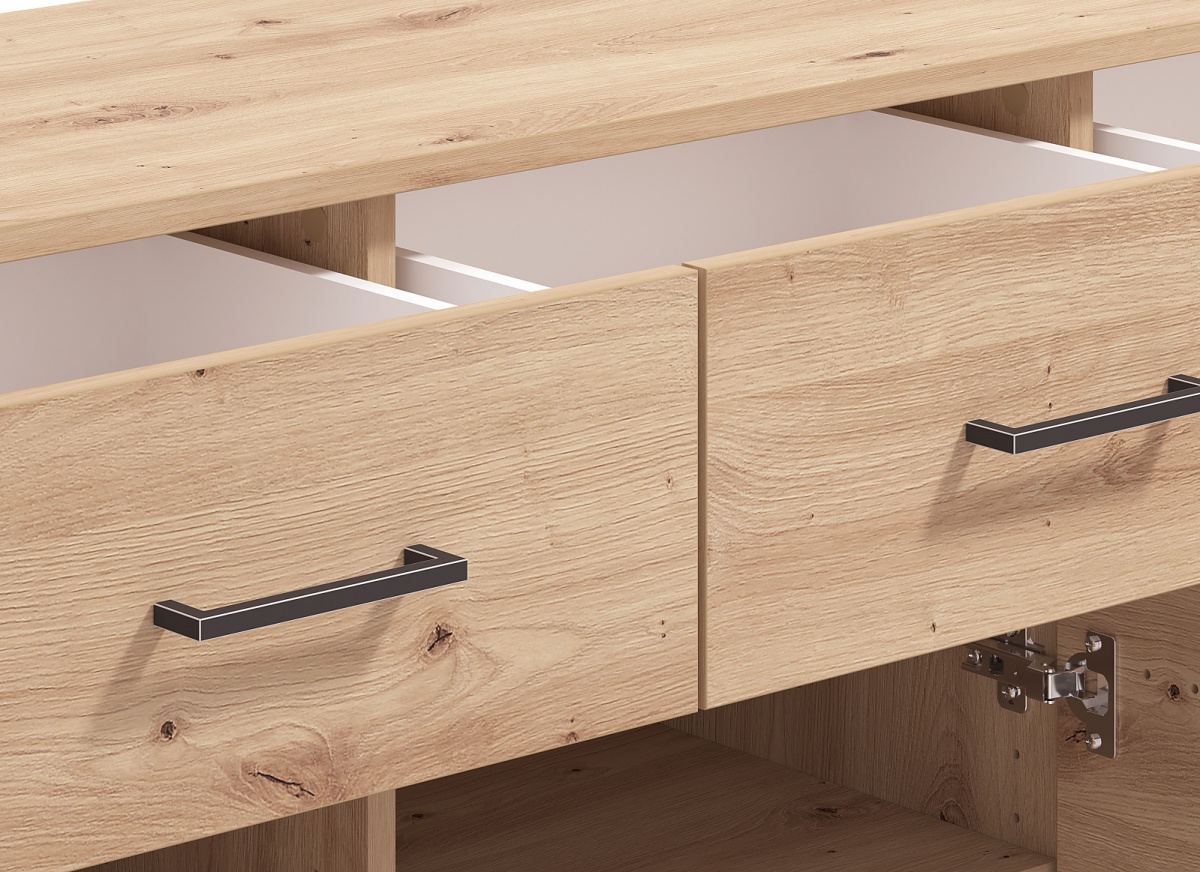 Kombinované komody jsou praktické, dostatečně prostorné, a navíc velice univerzální, jelikož skvěle zapadnou do každé místnosti. Jejich využití je tak takřka neomezené. Komoda je opatřena 3 dvířky za kterými najdete prostory rozdělené policí. V horní části se nachází tři zásuvky. Dekor dubu artisan patří mezi nejoblíbenější dekory dřeva vůbec.