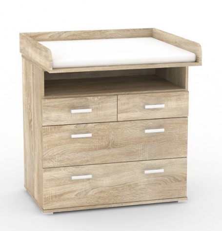 Komoda REA Mickey v odstínu dub bardolino s odjímatelným přebalovacím pultem a matrací má tloušťku přebalovací nástavby a dvířek 25 mm a ABS hranu 2 mm. Ostatní desky mají tloušťku ABS hrany 0,5 mm. Skládá se ze 4 šuplíků, jedné police a přebalovací nástavby. Na šuplících je použitý plnovýsuv. Matrace je pratelná na 40°C. Rozměry komody jsou: 85/97x87x55/80cm (v,š,h.) K dokoupení máme v nabídce Chránič mickey (na matraci.)