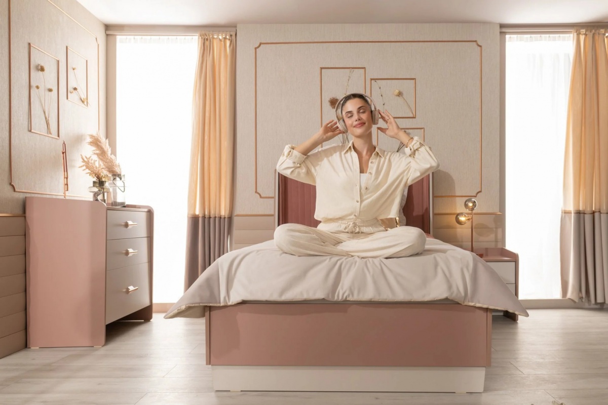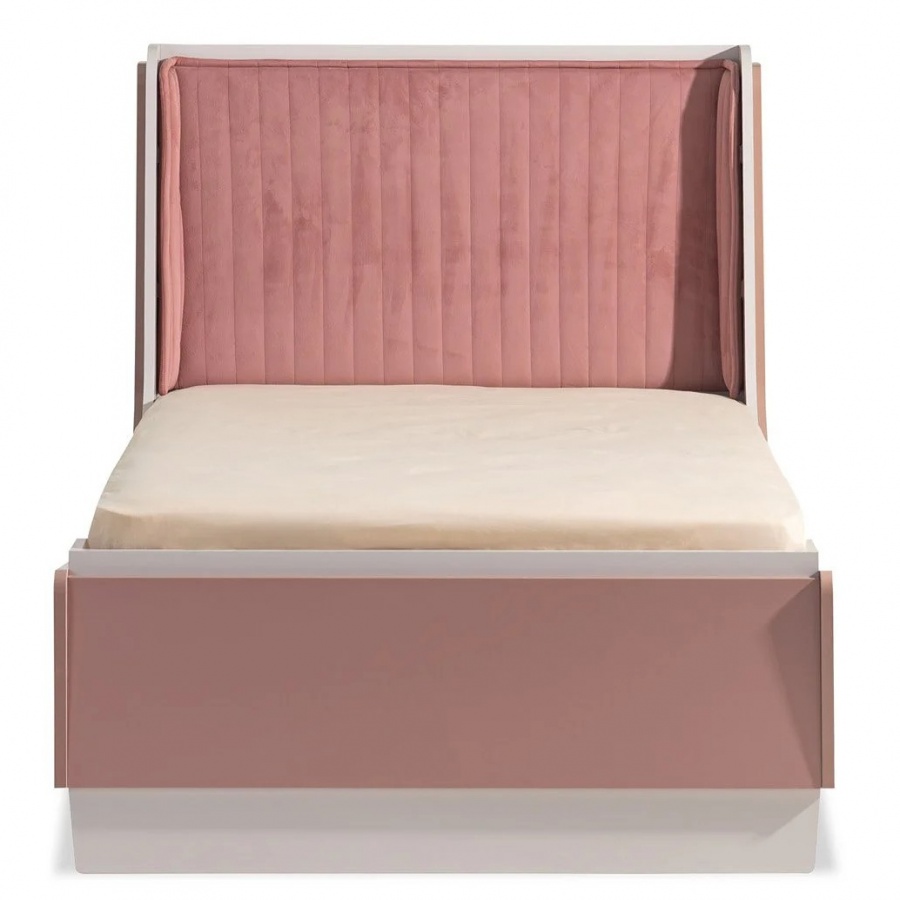 Tato postel s roštem spojuje sofistikovaný vzhled s komfortem a odolností. Dominantou je vysoké čalouněné čelo v růžovém 100% PES sametu s jemným prošíváním, které působí elegantně a zároveň poskytuje příjemnou oporu při odpočinku či čtení. Zaoblené rohy čela změkčují siluetu a dodávají celku moderní, přívětivý charakter.