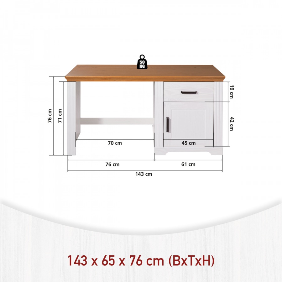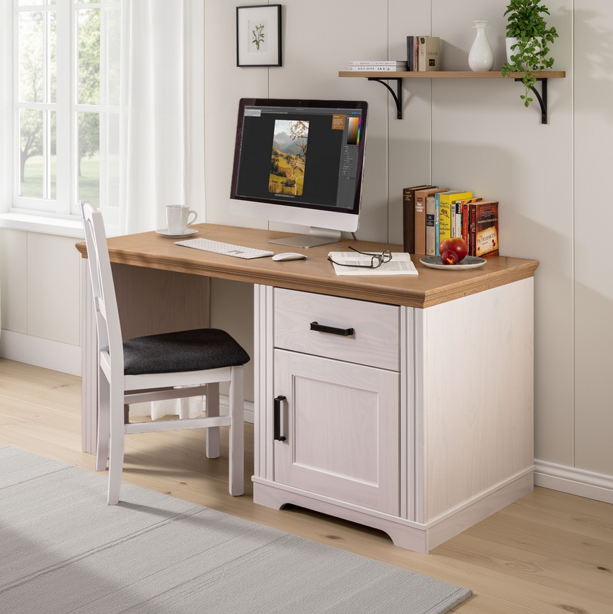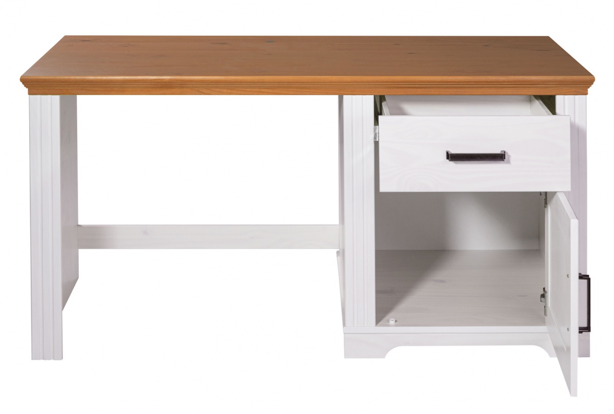 Psací stůl Malcolm z masivní borovice (Pinus Taeda) v bílé/dubové. Rozměry 150 × 65 × 76 cm. 1 dvířka, 1 zásuvka na kovových výsuvech, tlumené dovírání. UV lak, římsa 54 mm „Oak Colori“, kovová úchytka. Přírodní, odolný, snadná údržba.