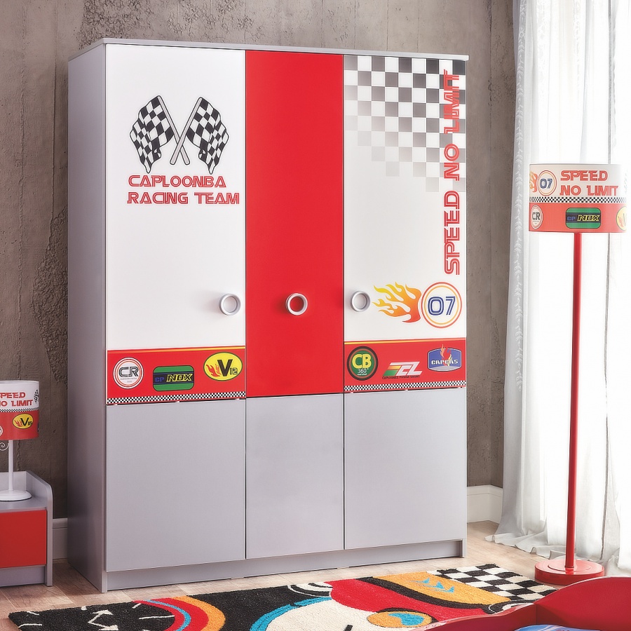 Třídveřová šatní skříň věrně přináší závodní atmosféru a místnost oživuje mnoha barvami. Dobře řešené jsou úložné prostory na oblečení a doplňky, ve výbavě jsou šatní tyče i police. U šatní tyče je příjemným bonusem LED senzorové světlo. U polic je nosnost 10 kg. Dvířka jsou opatřena panty se systémem tichého dovírání.