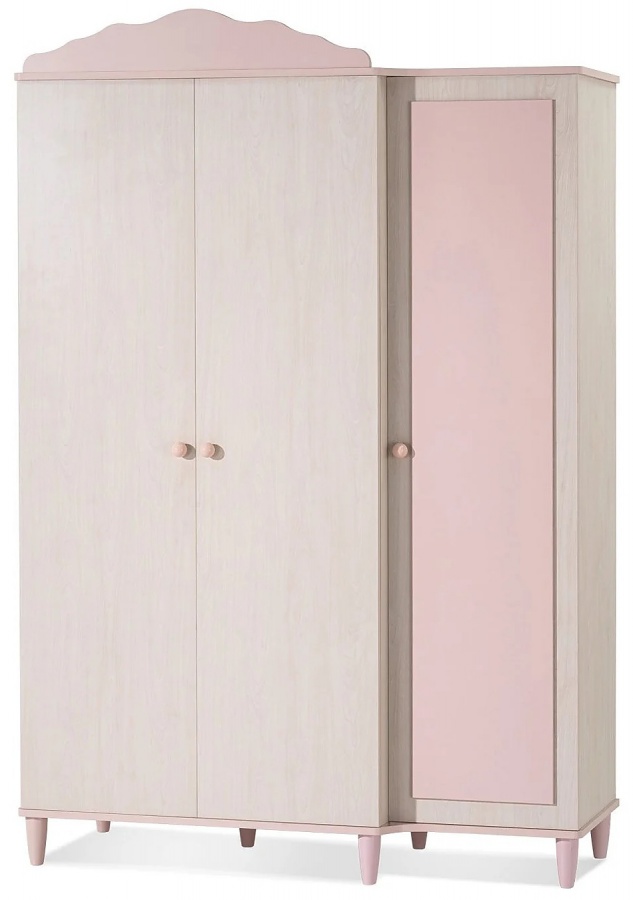 Třídveřová šatní skříň v originální barevné kombinaci dekoru břízy a růžové barvy zaujme hned na první pohled. Ozvláštnění vlnitou stříškou ji dodává exkluzivní vzhled. Velkou výhodou je integrované LED osvětlení, které se nachází v dvoudveřové části. Soft close je u tohoto produktu samozřejmostí, tudíž se nemusíte bát, že si dítko skřípne prsty mezi dveře či si nějak jinak ublíží. Jednodveřovou část lze nainstalovat jak napravo, tak nalevo, aby produkt co nejvíce vyhovoval Vašim domácím podmínkám. Vysoké nožky oceníte z hlediska úklidu, snadno se pod ně dostane i robotický vysavač.