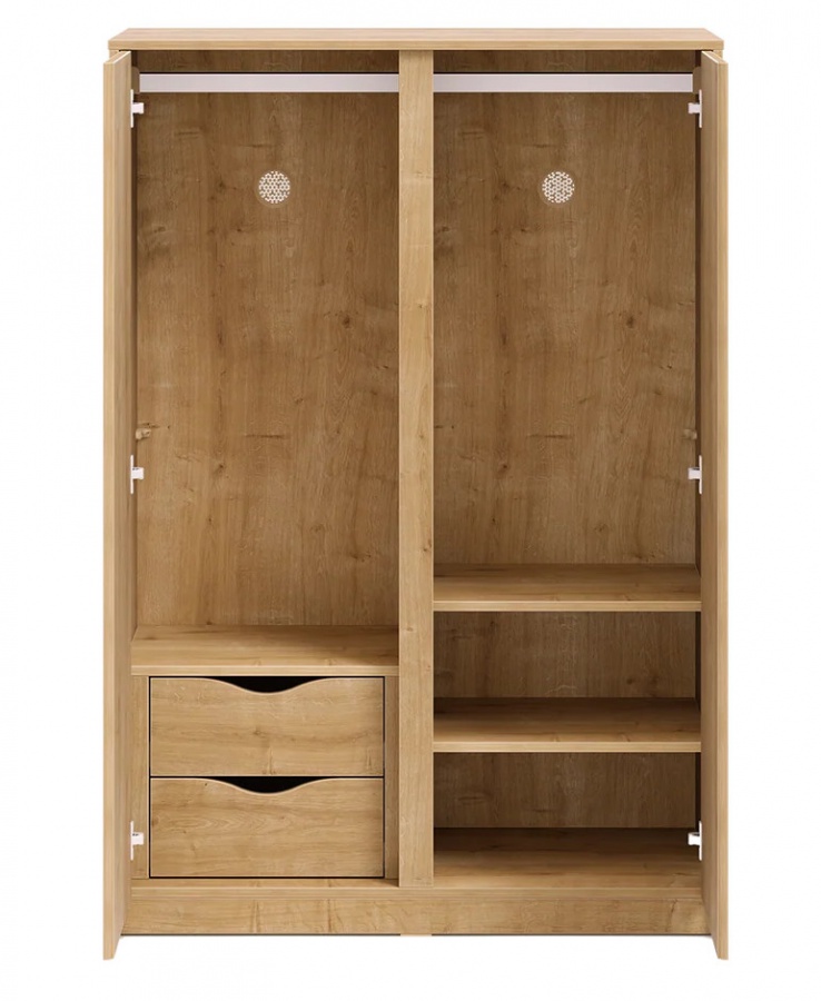 Šatní skříň Cody Modular v dekoru dub je promyšlené řešení do dětských i studentských pokojů, zejména tam, kde je málo místa. Dvoudveřová skříň z odolného lamina nabízí 3 praktické police, dvě prostorné zásuvky a dvě šatní tyče pro zavěšení oblečení i doplňků. Minimalistický, bezúchytkový vzhled působí čistě a bezpečně; systém soft‑close se postará o tiché a pomalé dovírání dvířek. Zaoblené hrany a rohy zvyšují bezpečnost při každodenním používání dětmi. Rozměry 97 × 141 × 52 cm umožní umístění i do menších interiérů nebo pod/vedle vyvýšené postele Cody Modular. Klasické otočné dveře, bez zrcadla a bez osvětlení, snadná údržba povrchu v dekoru dubového dřeva. Skříň je plně kompatibilní s dalšími prvky kolekce Cody, takže můžete postupně sestavit set přesně na míru pokoje – s dostatkem úložných míst pro jedno i více dětí. Dodání v demontu; jednoduchá montáž podle přiloženého návodu.