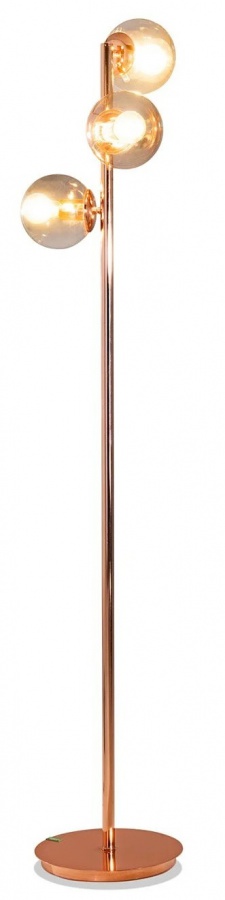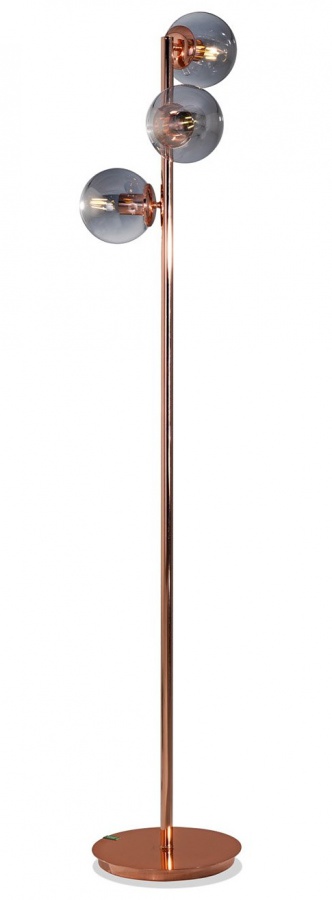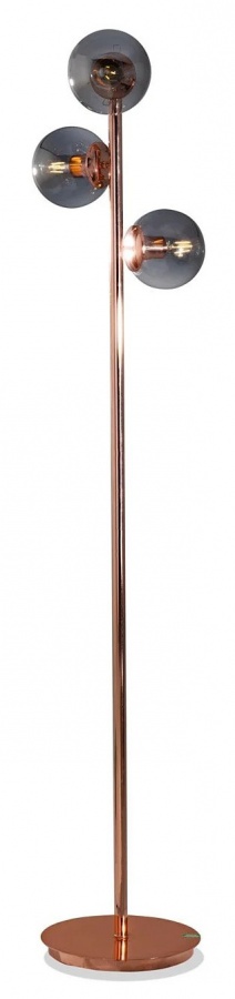 Designová stojací lampa Khalisa kombinuje luxusní vzhled růžovozlatého kovu a třech kouřově tónovaných skleněných koulí o průměru 15 cm, které rozptýlí světlo do měkkého, příjemně tlumeného svitu. Štíhlá silueta lampy na stabilní kulaté základně o průměru 30 cm a výšce 3 cm působí moderně i nadčasově, takže snadno zapadne do obývacího pokoje, ložnice i pracovny.