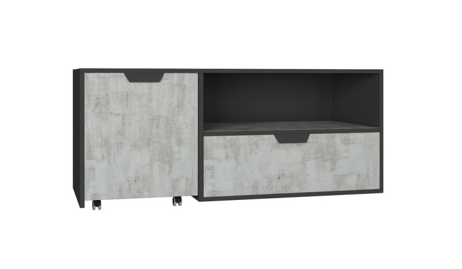 TV stolek můžete využít i jako nízkou komodu, je vybaven šuplíkem, otevřenou policí a výsuvným kontejnerem na kolečkách.