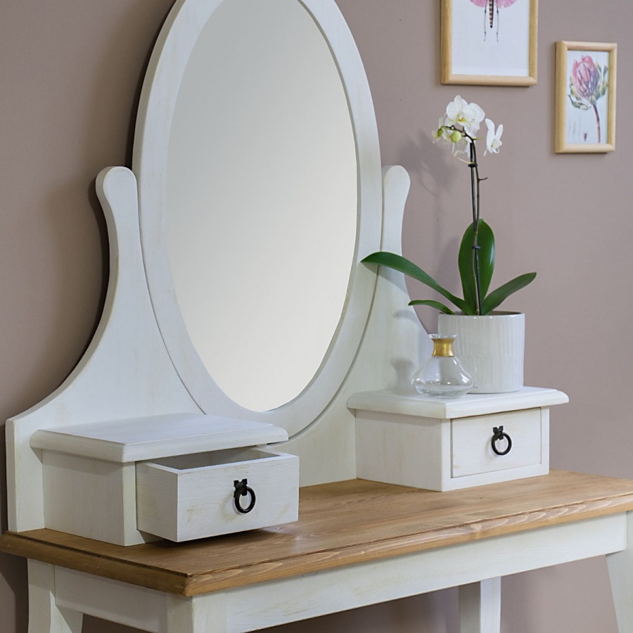 Ne každý se rád dívá do zrcadla, ale v tomto případě se určitě budete rádi koukat přímo na zrcadlo! Dřevěný rám z masivního borového dřeva v různých odstínech moření dělá z tohoto zrcadla skutečnou pastvu pro oči! Kromě oválného zrcadla vás nadchnou také šikovné odkládací zásuvky.