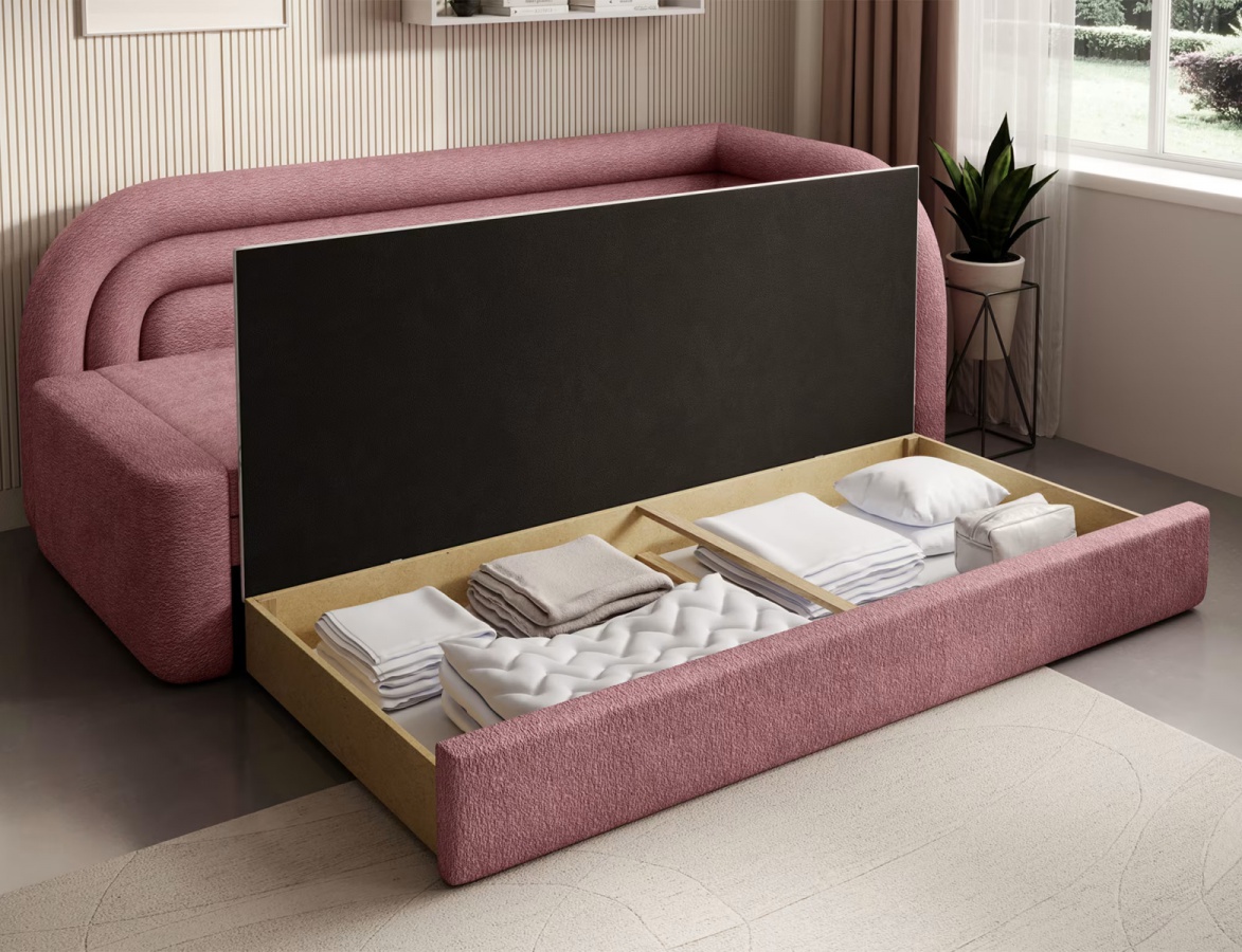 Potřebujete přespání pro hosty? Jednoduchý a intuitivní výsuv na kolečkách promění Fionu v lůžko s rovnou a pohodlnou plochou 135 × 199 cm. Prostorný úložný box (193 × 57 × 19 cm) snadno pojme lůžkoviny, deky či sezónní doplňky.