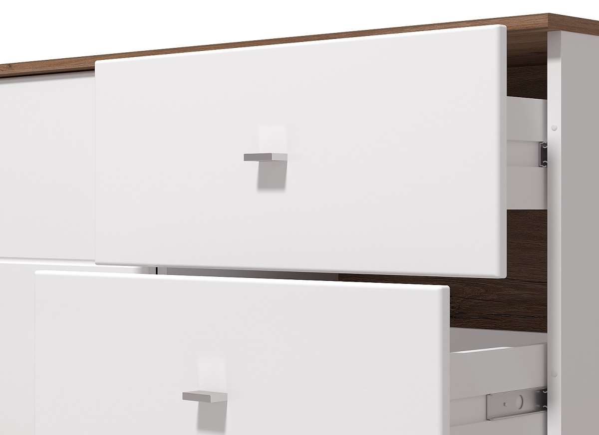 Kombinovaná televizní komoda nabízí to nejlepší. Vypadá stejně stylově jako klasické TV stolky, ale nabízí více úložného místa, je praktičtější a navíc se do ní nepráší. Dvě široké zásuvky jsou doplněny dvířky za kterými se nachází dvě přihrádky. Dvířka jsou ozvláštněná vyrytou linkou, která vytváří spolu se zásuvkami příjemný detail. Maximální nosnost zásuvek činí 3kg.
