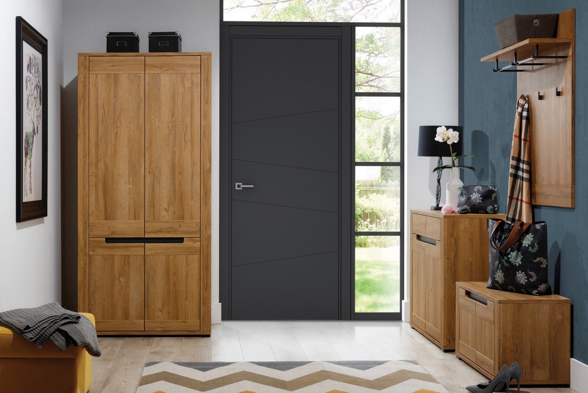 Moderní provedení nábytku Memphis oceníte v obývacím pokoji, jídelně nebo předsíni. Skříň Memphis je dvoudvéřová, vyrobená v kombinaci lamina a MDF desky, v barvách dub granson/grafit. Uvnitř je vybavena policemi.