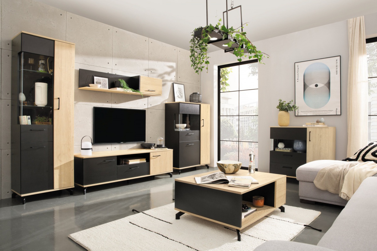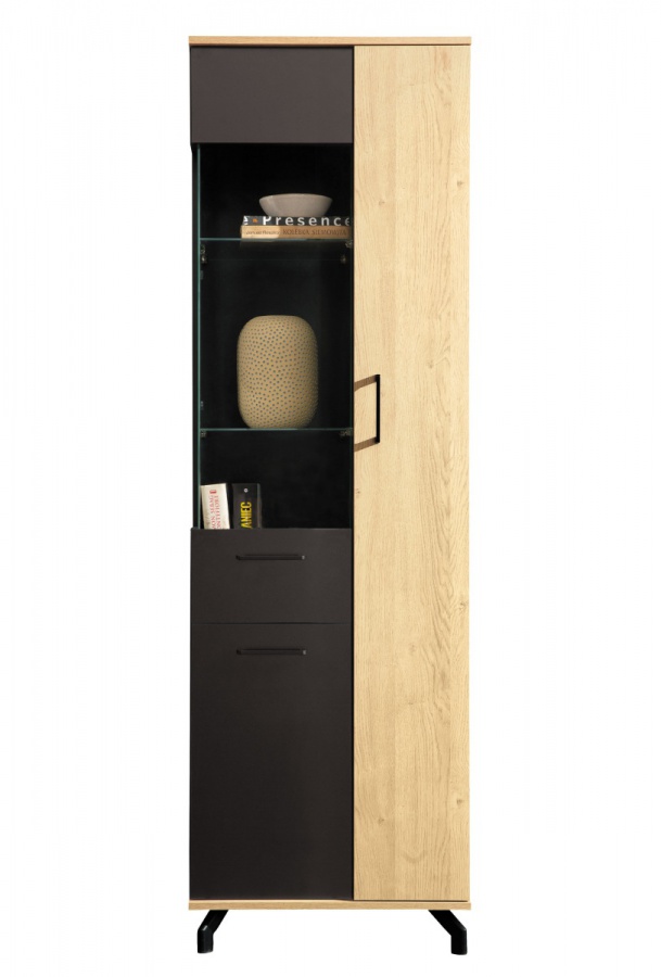 Do úzké skříně s prosklením pohodlně uschováte všechny potřebné předměty, ať už se jedná o sezónní dekorace, deskové hry či deky na zahřátí do chladných večerů. Na výběr budete mít ze tří uzavřených skříněk. Nábytek zdobí taky prosklené police, kam se hodí umístit dekorační předměty či například menší rostlinky. Díky orientaci skříně do výšky je vhodná i do menších interiérů. Univerzální moderní design skříně zajistí vizuální soulad s většinou sedacích souprav. Skříni dominuje dekor dubového dřeva, společně s černou barvou. Tuto kombinaci doplňují úchytky a stylové nožky v rovněž černém provedení.