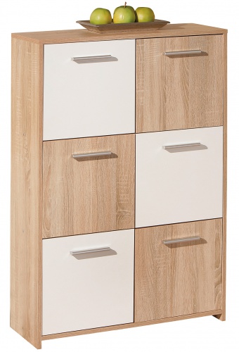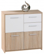 Komody jsou základním prvkem každého domova. Je praktická a nabízí velké množství úložného prostoru. Vysoká komoda z kolekce Nadia je opatřena šesti dvířky za kterými se skrývají otevřené prostory. Dolaďují je stylové úchytky ve stříbrném odstínu. Kombinace dekoru dubu sonoma s bílou barvou je módní, nadčasová a v současnosti velmi oblíbená.