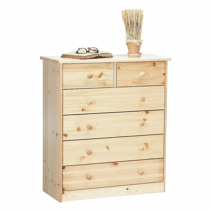 Komoda s 2 menšími a 4 širokými zásuvkami na kterých se nachází kulaté rukojeti. Navíc lze využít i horní odkládací plochy. Povrch je ošetřen lakem v bezbarvé variantě.