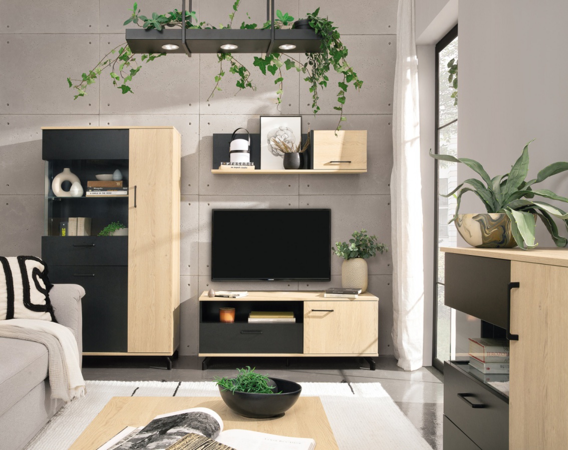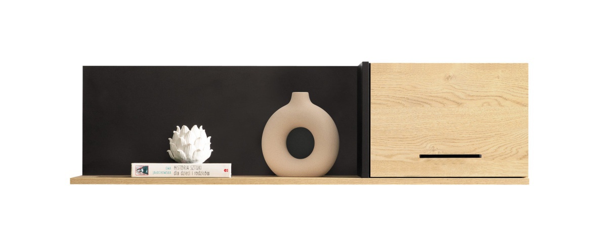 Závěsná police na stěnu ideálně doplní obývací stěnu v každém obývacím pokoji. Police nabízí moderní design v čele s dekorem dubového dřeva a černou barvou. Na polici můžete odložit například dekorační předměty, knihy či květiny. Zelená barva rostlin skvěle doplní již použitou kombinaci barev a dodá polici nádech přírody. Na pravé straně najdete uzavřenou skříňku, kam můžete uschovat i oku méně lahodící předměty či sezónní dekorace.